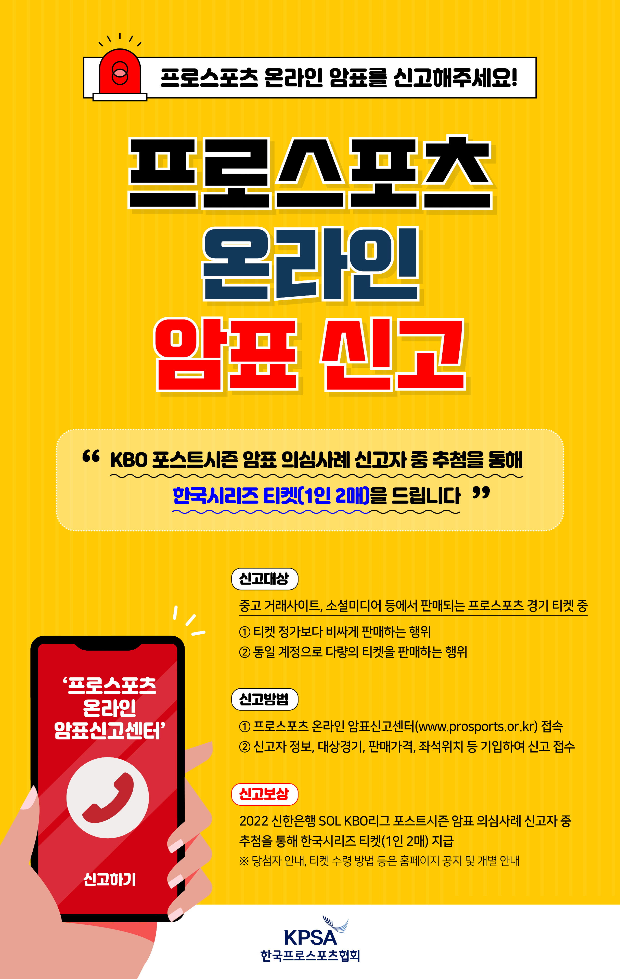 1. 본 이벤트는 2022 KBO리그 포스트시즌 암표 의심사례에 대해 10월 30일(일) 24:00까지 신고접수가 완료된 건을 대상으로 추첨이 진행되며,